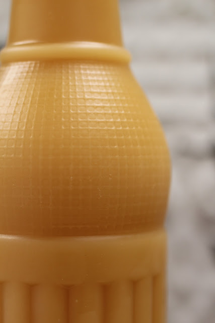 This large square beauty features the text, “4 OUNCES PURE HONEY”, and it has an image of a beehive between two trees with four little stars dancing overhead. What better bottle to pour from beeswax!